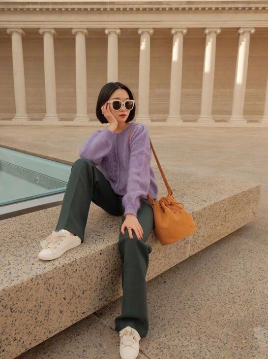 因为黑色很百搭,所以紫色与黑色完全没有问题,不同深浅色调的紫色与黑色都可以很好的搭配在一起。,青黑色条纹长裤是一种偏向于男性气息的单品,但将其与浅紫色宽松的高领针织衫搭配穿着,可以打造出很好的冬季造型,尤其对具有端庄女性气质的成年女性看起来不错。