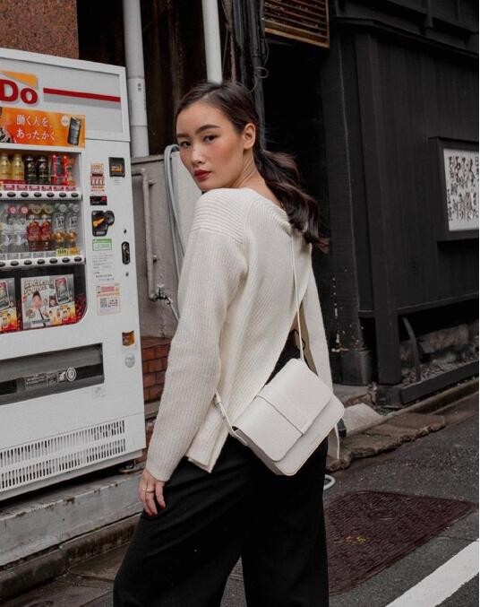 选择白色交叉露背的针织衫搭配黑色长裤,黑白结合经典又时髦,穿在身上更是凸显出随性慵懒的气质。