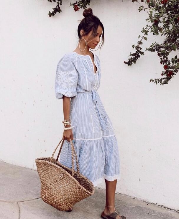 彩色条纹衬衣连衣裙淑女靓丽,超长款的设计营造无敌大长腿,但注意配饰不要选择过多的颜色,度假拍照的必备范本。