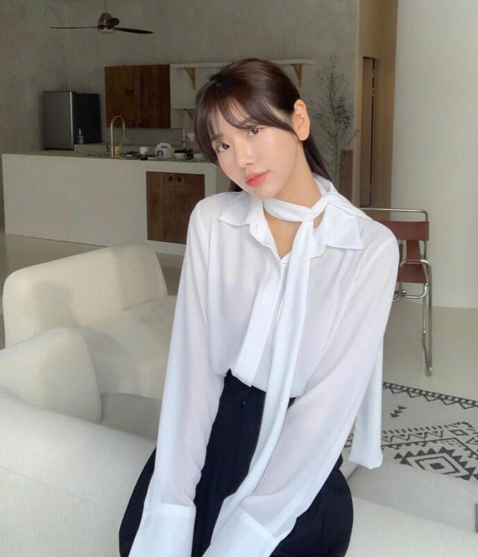 这款衬衫采用真丝弹力缎制作,非常宽送,喜欢穿非常松垮衣服的可以选择这一款,袖口为马蹄袖,扣子为天然贝壳扣,搭配的真丝带,下装黑色西装裙,很好看。