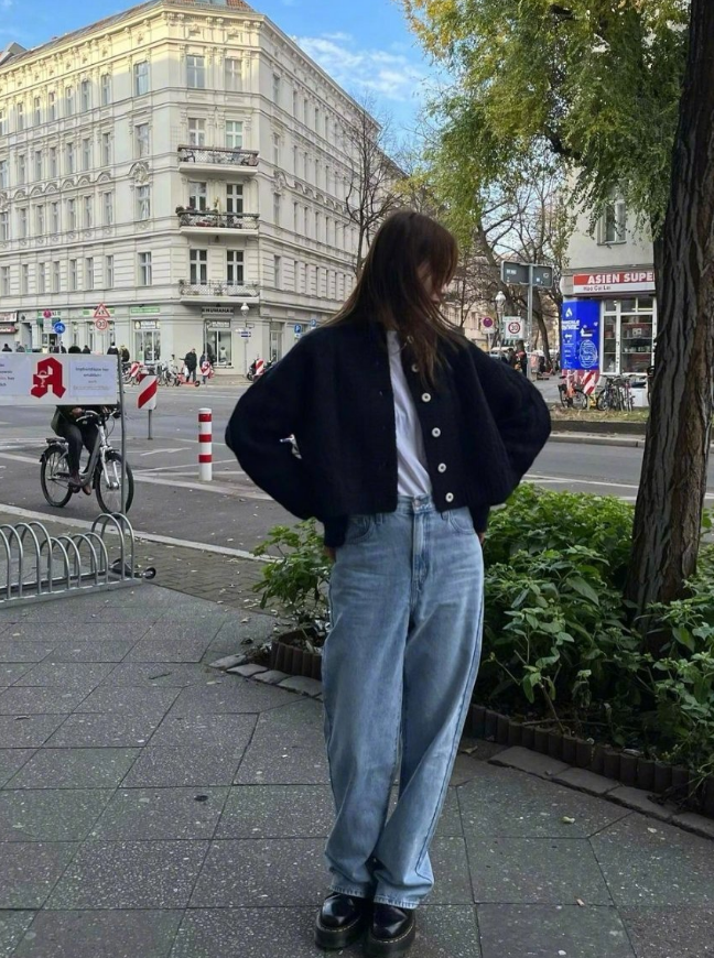 黑色短款外套搭配牛仔阔脚裤总是会让女生更加地出彩。