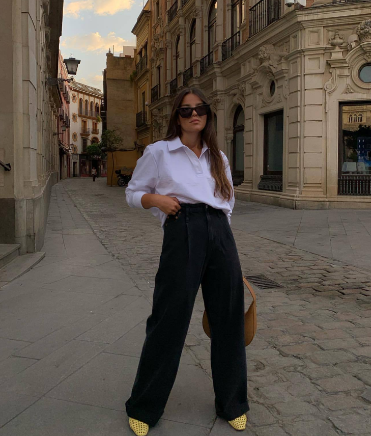 这款白色长袖Polo衫配黑色阔脚裤可以轻松穿出帅气感,无论搭配紧腿裤还是阔腿裤立马呈现利落率性的既视感,喜爱中性风的小花们一定不会放弃这样简约大气的搭配!一双镂空的荧光尖头单鞋,把原本简约的搭配提高了时尚度!