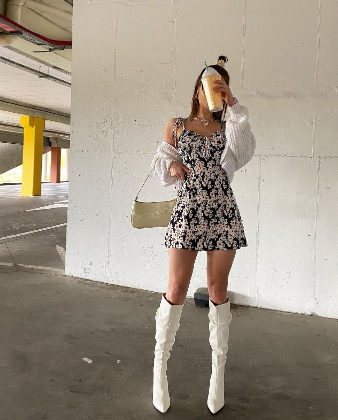 黑底白花碎花连衣裙,有一种温柔的气质,上身是非常显白的。领口还有系带的设计,可以自行调节。搭配一件奶白色的针织毛衣开衫,在春天的时候很需要一件毛衣开衫呢。