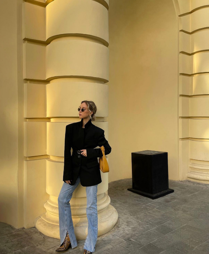黑色毛呢外套+开叉牛仔裤,鞋子则可以搭配尖头的蛇纹靴,尽显精致感。配色土黄色简约手腕包,超有时尚气质。