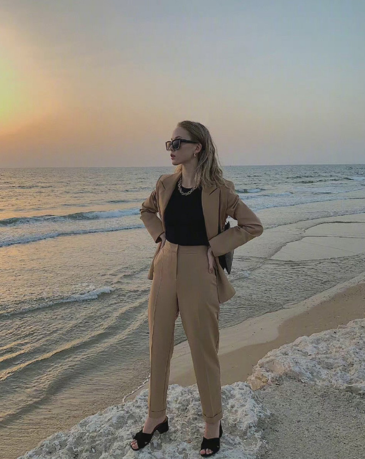卡其色套装还是很不错的选择,温柔大方,有一些俏皮的感觉,它既有优雅又有时尚魅力,非常适合日常旅行。