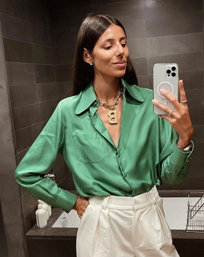 缎面衬衫最简单的穿法就是塞裤腰了。这种穿法既可以避免缎面衬衫因为极强的垂坠感而显得拖沓,又可以凹出高腰线,对小个子的女生也很友好。不过,塞裤腰看似简单,却也有很多细节需要注意。