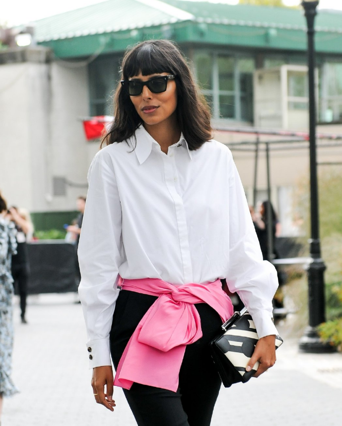 法式随性风格的其中一个重点就是不用在颜色上花太多心思,全白又有何不可?质感柔软的白色衬衫配搭深灰色高腰裤,感觉毫不费力,却能悄悄地改善身形比例。