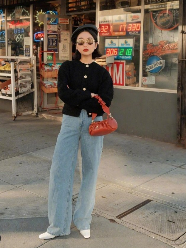 说到百搭,牛仔裤也是有着重要地位,作为人人必备的时尚单品,牛仔裤也是能够很好地hold住全场,黑色小毛衣搭配蓝色牛仔裤,女人味儿十足。