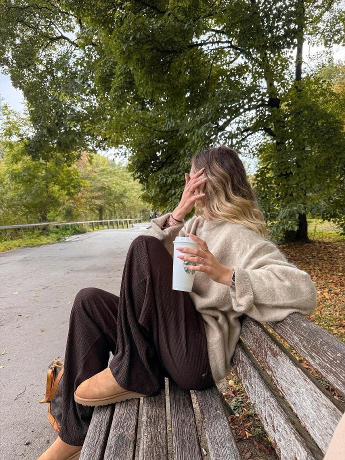 在色彩上,Celinekmn 格外偏爱 “低饱和大地色”。不是浓烈的焦糖或深沉的墨绿,而是像奶茶棕、燕麦色、浅卡其、柔雾灰这类温柔的色调,单穿显气质,叠穿也不会杂乱。她曾分享过一套经典搭配:浅燕麦色的高领打底,外搭一件奶茶棕的短款针织开衫,再套一件浅卡其色的长款风衣,三个颜色同属大地色系,却有深浅过渡,视觉上格外和谐;下装是一条烟灰色的灯芯绒半身裙,长度到小腿中部,走路时裙摆轻轻摆动,配上一双米色的短靴,整个造型没有一处用力的设计,却把秋日的温柔拿捏得恰到好处。就连配饰,她也坚持 “少而精”—— 一条细巧的银色锁骨链、一只米色的皮质托特包、一顶浅棕色的针织贝雷帽,都是小而精致的存在,悄悄提升整体造型的完整度,却从不过分抢镜。
