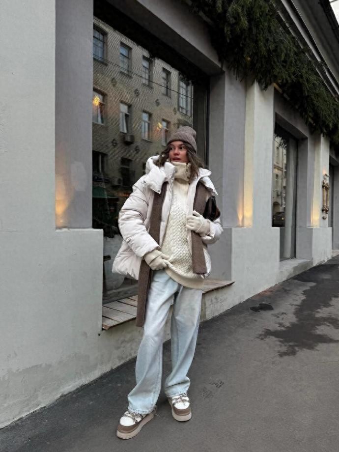 她的穿搭里,“氛围感” 从来不是靠单品堆出来的,而是藏在色彩和面料的搭配里。juliammmuse 很擅长用 “低饱和色系 + 柔和面料” 打造高级感,比如浅驼色的羊绒针织衫配烟灰色的灯芯绒长裤,柔软的针织贴肤,垂坠的灯芯绒显质感,两个颜色都不张扬,却能相互衬托;再拎一个米色的皮质托特包,戴一副细框眼镜,整个造型透着温柔的知性气。她也偶尔会尝试撞色,但从不会选高饱和的对比色,而是像浅燕麦色配柔雾蓝、奶茶棕配浅卡其这类 “软撞色”,比如一件浅燕麦色的长款风衣,内搭一件柔雾蓝的针织连衣裙,裙摆露出一点点在风衣外面,脚下踩一双棕色的短靴,色彩和谐又不单调,走在街头就像自带一层柔光滤镜。