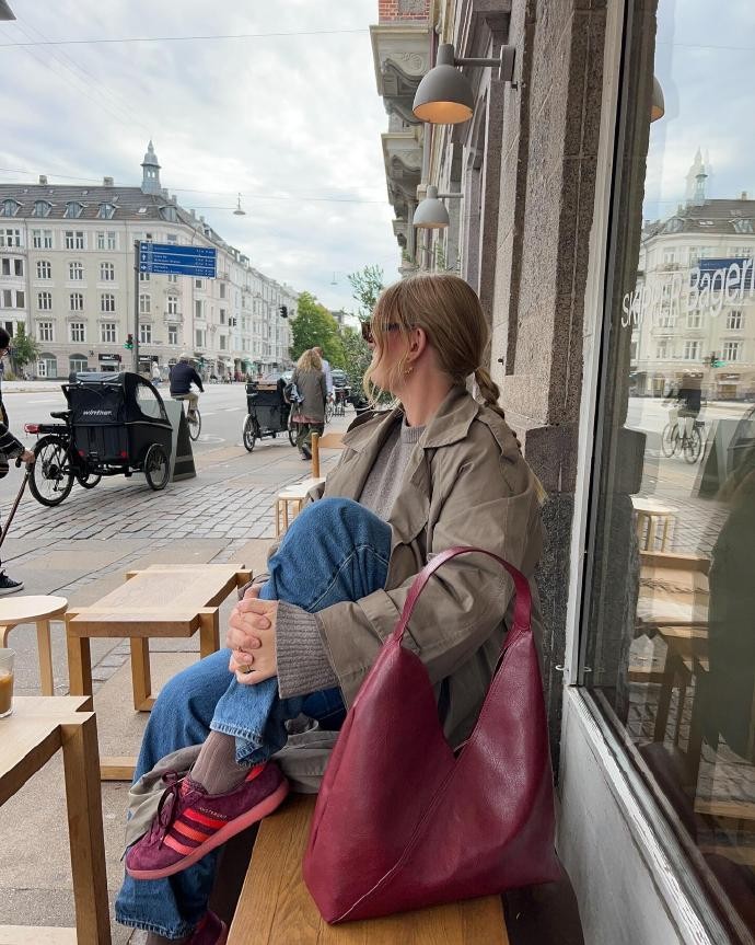 在单品选择上,Maria 从不追求复杂设计,反而偏爱基础款的 “质感为王”。她的冬日衣橱里,总有几件翻领羊毛大衣,颜色多是浅驼或淡灰,版型是利落的 H 型,不挑身材却能撑起气场,搭配同色系的围巾和乐福鞋,通勤或约会都合适;还有 oversize 的粗线毛衣,她会故意选大一个码,下摆随意塞进半条裤子里,露出一点点腰线,再配一条浅卡其色的阔腿裤,踩一双白色老爹鞋,既有慵懒感又不会显得邋遢。就连配饰,她也坚持 “低饱和原则”—— 银色的细链条项链、米白色的皮质托特包、浅棕色的针织贝雷帽,都是小而精致的存在,悄悄提升整体造型的完整度,却从不过分抢镜。
