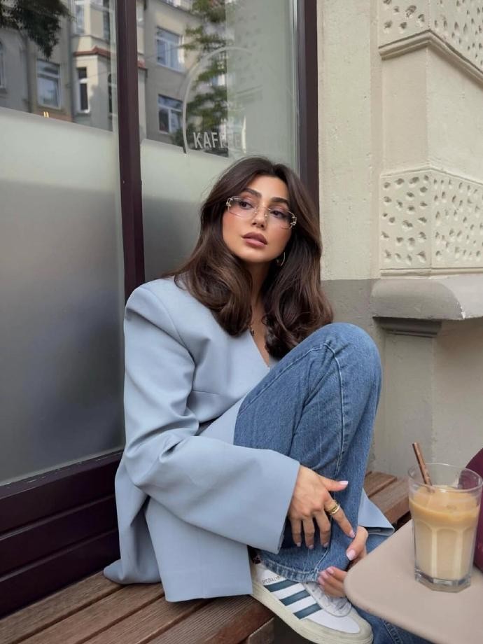 作为德系穿搭的典型代表,aydahadi 把 “松弛感” 拿捏得恰到好处。她的穿搭很少有紧绷的设计,大多选择宽松适度的版型,既不会过于拖沓,又能给身体足够的舒展空间,自带一种随性自在的气场。比如她常穿的 Oversize 西装,搭配直筒牛仔裤和小白鞋,没有刻意强调腰线,却能通过单品的比例平衡,显得身形高挑又利落;或是用长款针织开衫搭配简约连衣裙,脚下踩一双乐福鞋,温柔又大气,完全不费力就赢了质感。