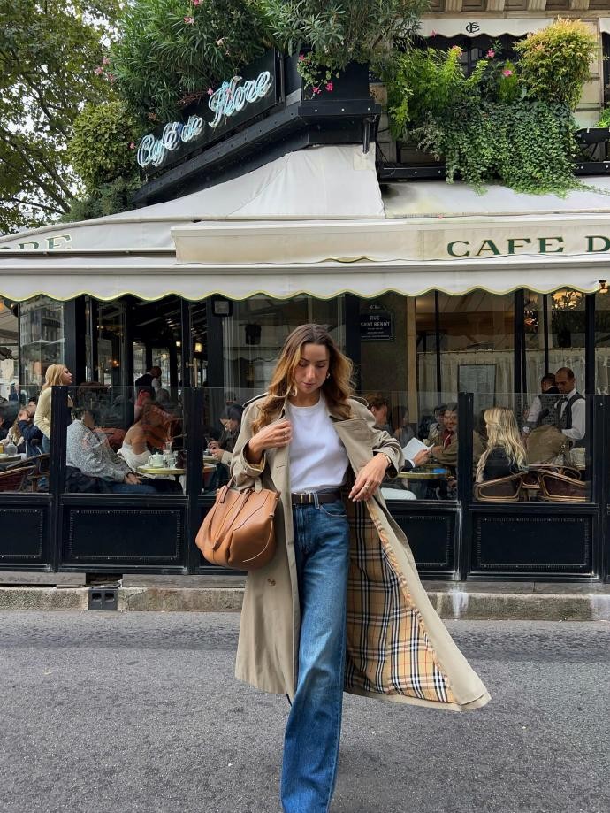 春节外出逛街或是打卡新春市集,穿搭需要兼顾灵动与吸睛,lise_frt的这套搭配既符合场景需求,又充满年味巧思。浅卡其色工装风外套搭配白色阔腿牛仔裤,打破了工装风的硬朗感,增添了休闲活力,内搭一件浅灰色印花T恤,印花选用简约的灯笼、祥云等新春元素,隐晦传递节日氛围,不刻意不浮夸。外套的多口袋设计兼具实用性与装饰性,可放置手机、口罩等小物件,脚下搭配一双白色老爹鞋,舒适耐走,适合长时间逛街。配饰上选择一款黑色皮质棒球帽,既能修饰脸型,又能增加造型的层次感,整体造型清爽利落,在人群中辨识度十足,同时完美契合新春市集的热闹氛围。
