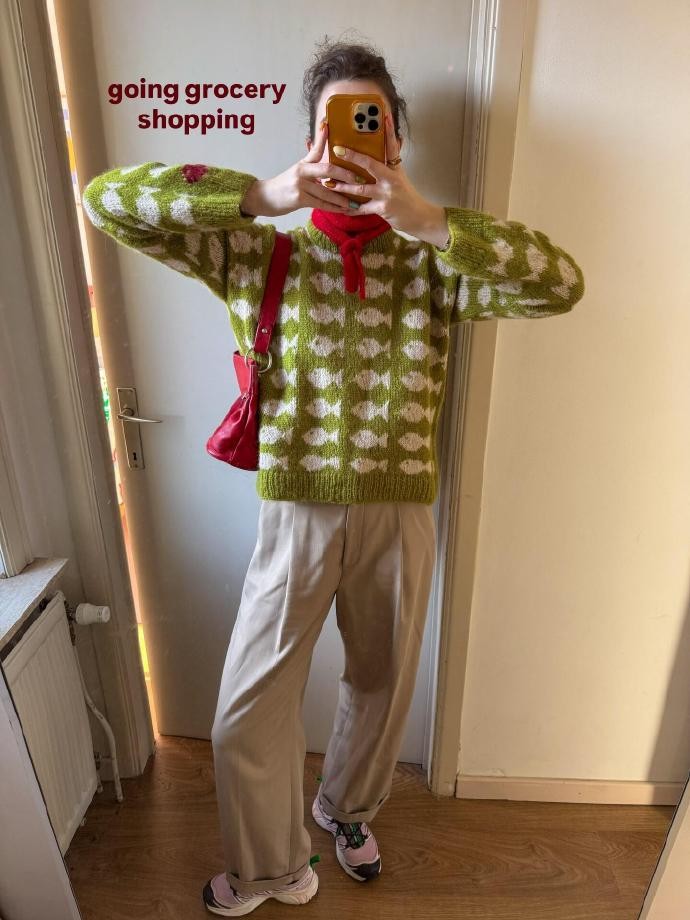 色彩与复古元素的碰撞,是 charlotte.vandaele 穿搭最鲜明的标识。她大胆运用高饱和色彩,绿色小鱼图案毛衣搭配红色围巾,撞色之间充满童趣与活力;豹纹连衣裙搭配红色丝袜,复古又张扬,在管理活动的场合中脱颖而出。同时,她也擅长用经典复古元素丰富层次,格纹毛绒外套、波点阔腿裤、拼接牛仔裤,这些充满年代感的单品在她的搭配下,既保留了复古韵味,又融入了现代的松弛感。更值得一提的是,她对红色包包的反复运用,无论是搭配休闲装还是正式裙装,都能成为造型的点睛之笔,让整体风格更具辨识度。