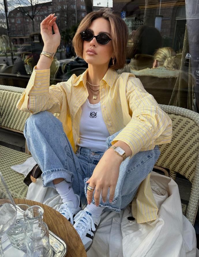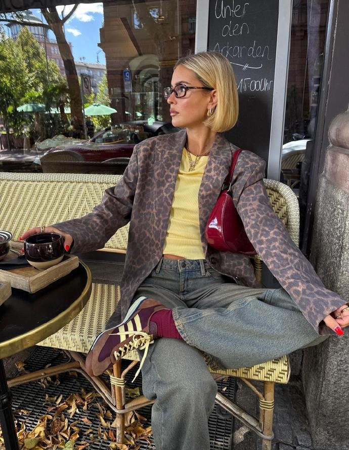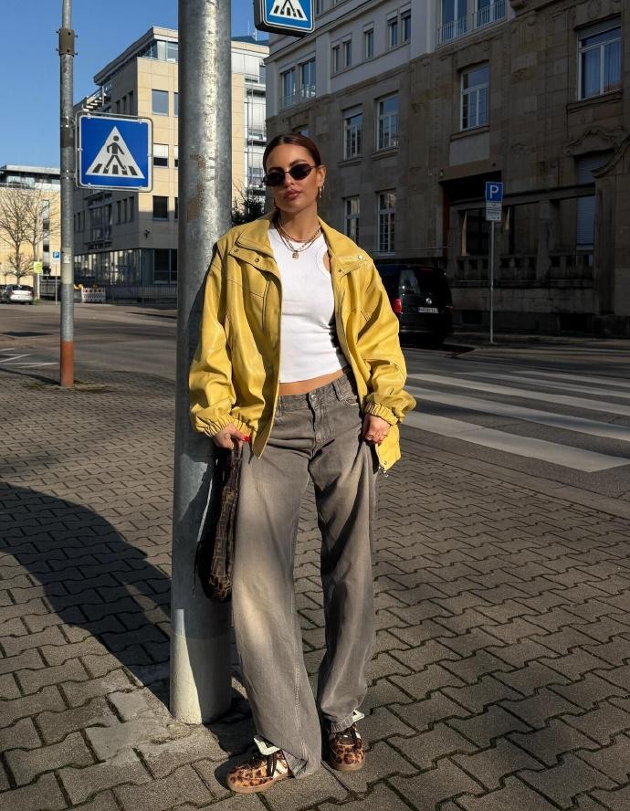 在色彩搭配上,julia.kammerer 的 yellow fits 系列展现了极高的审美水准,她擅长用不同色调的黄色搭配基础色,也敢于尝试大胆的撞色与混搭。浅黄、鹅黄、明黄等不同明度的黄色,在她的搭配中各有韵味:鹅黄色衬衫搭配灰色百褶短裙,温柔又减龄;明黄色皮衣碰撞烟灰色牛仔裤,酷感中透着活力;奶黄色针织衫叠穿同色系衬衫,层次感十足又尽显软糯。同时,她还大胆解锁黄色与豹纹、格纹的组合,豹纹西装内搭淡黄色针织衫,复古又个性,黄色衬衫搭配蓝白格纹阔腿裤,随性又不失设计感,每一种搭配都精准踩中时尚与日常的平衡点。
